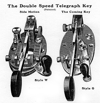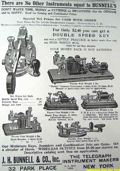 The first Double Speed Key as introduced in 1904 was an all metallic version. It had a large hole in its brass base and had an adjustment for the lever's spring tension. It is exactly what is shown in the Bunnell ad in this article as, "style W."