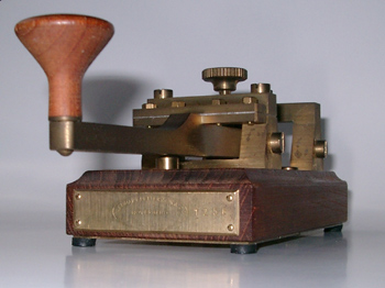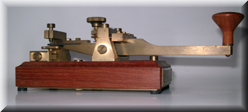 The key is mounted on a nicely finished dark hardwood (mahogany?) base which