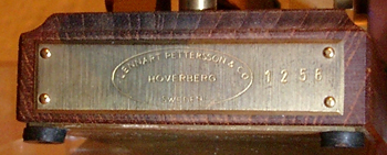 conceals a heavy weight under a brass plate. Pettersson's logo and a serial