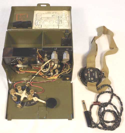 Manual telegraph set consisting of telegraph key, line relay, oscillator (howler) and telephone headset.